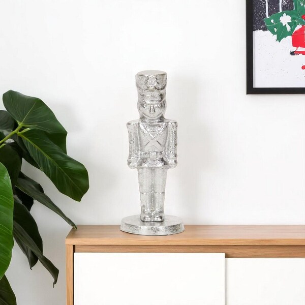 Add some christmas cheer to your space with this 7-inch silver cast iron christmas nutcracker hand painted figurine. It's a perfect addition for those who love an up-to-the-minute look and feel. This handcrafted piece showcases meticulous artistry with its vibrant colors and detailed features. The unique coat and paint distressing give it a charming vintage appeal, perfect for enhancing holiday decor. As a delightful figurine, it brings a festive atmosphere to any room. Elevate your seasonal celebrations with this enchanting centerpiece that effortlessly combines tradition and modern sophistication. 7.00-inch h x 2.75-inch w x 2.75-inch d.