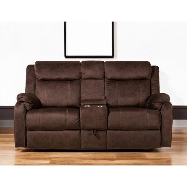 Designed for comfort and good looks, this 70-inch dark brown manual reclining loveseat with storage is a great option to anchor your space. A center console makes this loveseat not only good looking but practical. Pillow top arms offer a comfy place to rest and give this piece some interest and shape. A great showpiece for your room, this sofa is a must have. 40.94-inch H x 70.07-inch W x 37.01-inch D