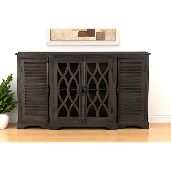 Storage vessels don't have to be unsightly. Increase your storage space and the fashion quotient of your room with this hard wearing, versatile, and good looking cabinet. Crafted from solid wood, this sideboard combines durability with elegance, featuring a stunning dark brown finish that enhances its traditional style. The doors feature a mix of ribbed shutter design and carved geometric scroll with glass, while the black hardware finish complements the overall design. With shelves included, you'll enjoy ample space for organization, and the doors will give you a mix of hidden and partially hidden storage, making it a functional yet stylish addition to your home. 40.00-inch h x 70.00-inch w x 18.00-inch d.