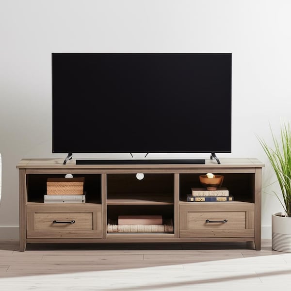 Experience entertainment right in the comfort of your own home with the 70-inch gray wood enclosed and open storage tv stand. Designed to be sturdy and long lasting, this versatile furniture piece is crafted from durable particle wood and features a modern design style. To add to the versatility, this piece features open non-concealed storage that can be used for not only storage but display as well. A cord cut out hole is ideal for wire and cable management to keep your space look tidy. Ideal for tv placement and storage in your living room, bedroom or office. 24.8-inch h x 70.08-inch w x 15.35-inch d.