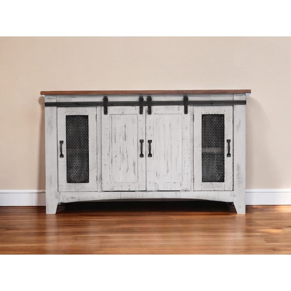 Experience entertainment right in the comfort of your own home with the 70" white solid wood cabinet enclosed storage distressed tv stand. Curated from high quality solid pine wood, this console is natural, beautiful, and built to last. Due to the genuine nature of the wood some natural wood knots, and grain and color variations may occur. T Built-in cable and wire management helps to keep those unseamly wires at bay. Convert your room into a special place with your favorite collectibles and TV accessories that is suitable for living room, bedroom, or office. 34.75" H x 70" W x 19" D