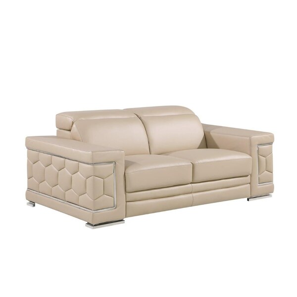 Superior construction from fabulously soft and high grade leather gives this 71-inch beige and silver genuine leather love seat a leg up on the competition. The premier grade Italian leather used makes your lounging luxuriously comfortable and adds an elegant appeal to your space. Square arms offer a comfy place to rest and give this piece some interest and shape. Silver steel legs effortlessly elevate the room and add a touch of contemporary design. A great showpiece for your room, this sofa is a must have. 29-inch H x 71-inch W x 41-inch D