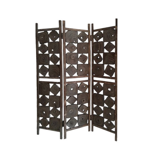 Enhance your living space with this elegant 71-inch solid wood room divider featuring three folding panels. The rich brown color adds warmth and sophistication to any room, while the sturdy solid wood construction ensures durability and longevity. The folding design allows for easy placement and storage, making it a versatile addition to your home decor. Use it to create separate areas in a bedroom or studio apartment, or simply to add a touch of privacy to a living room or office space. This room divider is both functional and stylish, making it a perfect choice for dividing space in a chic and practical way. 71-inch H x 53-inch W x 1-inch D