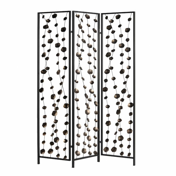 Divide your space stylishly with this 71-inch gray iron folding three-panel screen room divider. The contemporary design, crafted from sturdy iron, adds a modern touch to any room. The gray color complements a variety of decor styles, while the three panels provide flexibility in defining separate areas within your living space. Ideal for creating privacy or dividing a large room, this folding screen seamlessly combines functionality with a sleek and sophisticated aesthetic. Perfect for adding a decorative element to your home while also serving a practical purpose, this metal room divider is a versatile and chic addition to your interior design. 71-inch H x 48-inch W x 1-inch D