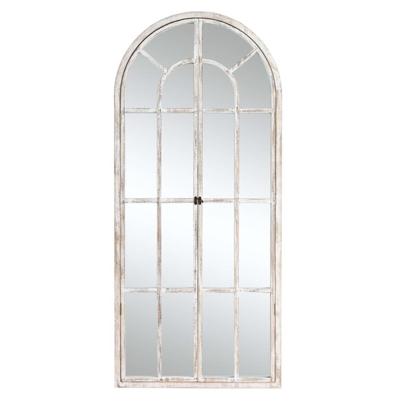 An antiqued and distressed mirror finish gives this piece lots of vintage charm. Add a touch of classic elegance to your space with this arched mirror framed in white wood. The vertical orientation and wall-mounted design make it a versatile piece for any room in your home. Measuring 31.44 inches wide, this standing mirror is perfect for a quick outfit check or adding depth to your living space. The antique mirror finish adds a touch of old-world charm, while the casual and timeless style blends seamlessly with any decor scheme. A must-have piece to enhance the aesthetic appeal of your home. 70.74-inch H x 31.44-inch W x 1.18-inch D