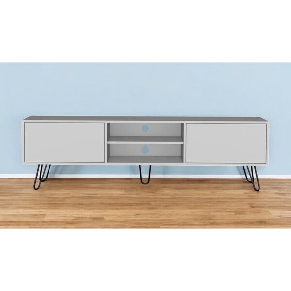Ready to be enjoyed in your living room, family room, or recreation room, this 71-inch white cabinet open and enclosed storage tv stand is a practical and good looking piece of furniture that will help to anchor your room. Features a clean and modern all over white with black hairpin legs, creating an ideal way to stylishly fight clutter and set up your entertainment at the same time. To add to the versatility, this piece features both concealed and open non-concealed space that can be used for not only storage, but display as well. 20.7-inch H x 70.9-inch W x 13.8-inch D