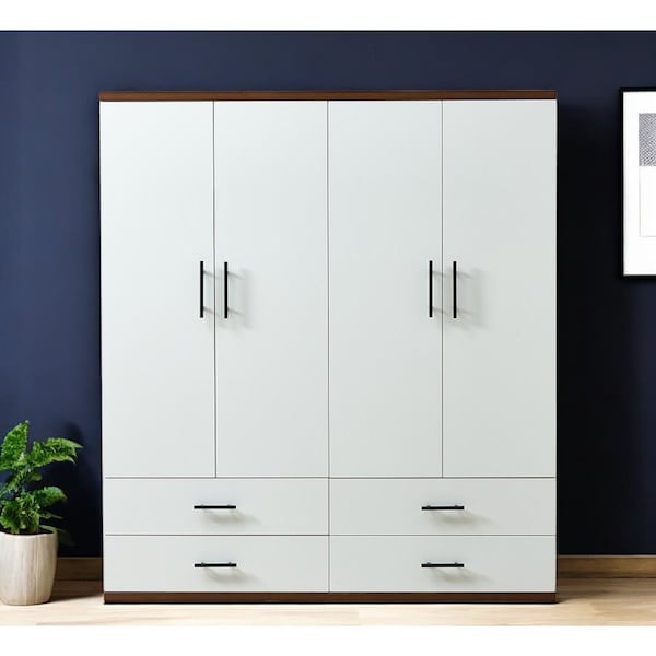 Add personality to your bedroom style and a feeling of coziness with this 71-inch white four door four drawer combo dresser. Versatile in use, this combo dresser is equipped with both drawers and doors for all your storage needs. Equipped with four easy open drawers for practical and good looking clothing storage. This double wardrobe dresser is made from sturdy manufactured wood that is built to last. The white and black coloration of this piece is neutral and will blend easily with most any decor. 70.87-inch h x 63-inch w x 19.8-inch d.