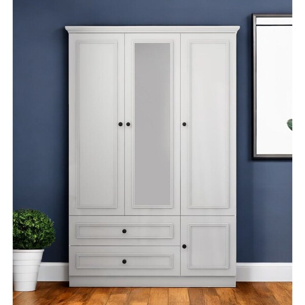 Add personality to your bedroom style and a feeling of coziness with this 71-inch white mirrored four door two drawer combo dresser. Versatile in use, this combo dresser is equipped with both drawers and doors for all your storage needs. This dresser is made from sturdy manufactured wood that is built to last. The white coloration of this piece is neutral and will blend easily with most any decor. 70.8-inch h x 47.2-inch w x 20.7-inch d.