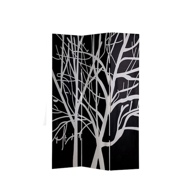The 72-inch black and white canvas folding three panel screen room divider offers a stylish solution for sectioning off spaces in your home. Crafted with a durable wood frame, this piece is both sturdy and lightweight, making it easy to reposition as needed. The three-panel design adds versatility, allowing you to create an intimate nook or separate areas in larger rooms. Each panel features a contemporary black and white canvas print, enhancing the aesthetic appeal of your decor while providing privacy. This folding room divider blends functionality with artistic expression, making it a perfect addition to any modern interior space. Elevate your home's ambiance while maintaining an open and airy feel with this elegant room divider. 72.00-inch h x 48.00-inch w x 1.00-inch d.