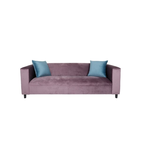 Add an air of fashion to your space with this fabulous 72-inch lavender velvet sofa and toss pillows with black legs. With a warm and rich look to it, this solid color standard is upholstered in velvet that is designed to be super soft to the touch, sturdy and resilient. Solid colors give you lots of decorative options and are easy to work into your decor scheme. Coil spring construction gives this piece strong support and makes it comfortable to sit even for long periods of time. Square arms offer a comfy place to rest. Black solid wood legs effortlessly elevate the room and add a touch of contemporary design. A great showpiece for your room, this sofa is a must have. 25-inch H x 72-inch W x 34-inch D