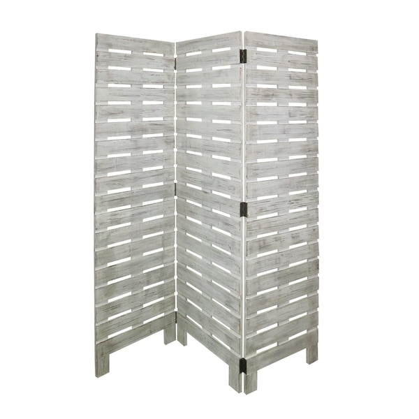 The 72-inch white wood folding three panel screen room divider elegantly transforms your space. Crafted from durable wood, it showcases a seamless blend of functionality and style. This folding design allows for easy setup and storage, making it perfect for creating intimate areas or private nooks within larger rooms. The three panels provide ample coverage while adding a touch of sophistication to your decor. Whether used to define spaces in a studio apartment or to enhance privacy in an office, this room divider is a versatile addition to any home. Its sleek white finish complements a variety of interior styles, enriching your living environment with contemporary charm and practicality. 72.00-inch h x 63.00-inch w x 1.00-inch d.