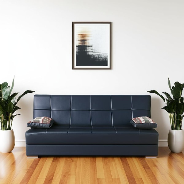 This 75-inch black faux leather convertible futon sleeper sofa and toss pillows with storage is made from sturdy and resilient faux leather that will look and feel like leather. Solid colors give you lots of decorative options and are easy to work into your decor scheme. Sinuous springs construction gives this piece strong support and makes it comfortable to sit even for long periods of time. Fixed arms offer a comfy place to rest. A great showpiece for your room, this sofa is a must have. 37.8-inch h x 74.8-inch w x 42.1-inch d.