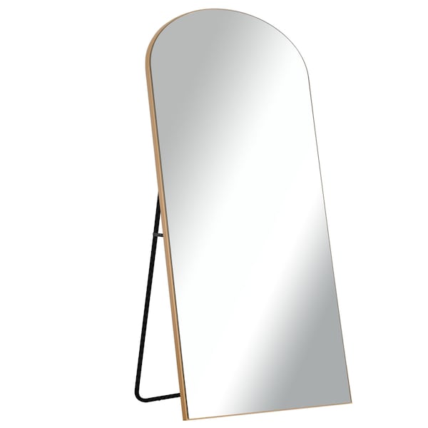 Enhance your space with the classic design of the 75-inch gold arch wood framed standing mirror. Crafted with a shatterproof mirror finish, this freestanding piece boasts a vertical orientation and an elegant arch shape. The rich gold color and wood frame add a touch of contemporary style to any room. With a generous width of 36 inches, this mirror is perfect for adding depth and brightness to your living area. Add a sophisticated touch to your decor with this standing mirror, a perfect blend of style and functionality. 75-inch H x 36-inch W x 0.79-inch D