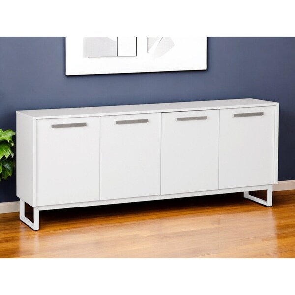Dress up your dining room, living room, bedroom, or hallway with this gorgeous 75-inch white wood console accent cabinet with four doors. This beautiful accent is made from sturdy MDF that is built to last. A console cabinet is versatile as it can be used for storing and displaying your electronics in the living room or used in the dining room or kitchen as a side board buffet style server. Storage vessels don't have to be unsightly. Increase your storage space and the fashion quotient of your room with this hard wearing, versatile, and good looking cabinet. 31.5-inch h x 75-inch w x 15.75-inch d.