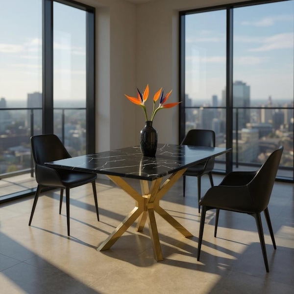 This good looking 79-inch black and gold marble and metal cross leg base dining table is sure to inspire compliments. The black marble top of this table is a nice visual contrast to the high quality, gold metal of the base. The two-tone color combination is attractive and fashionable. Seat up to 8 family and friends around your new dining table. This table is the sturdy, reliable and stylish answer to your dining room needs. This eye-catching dining table is ready for you to enjoy breakfast for one or entertain your guests. 29.9-inch h x 78.7-inch w x 39.4-inch d.