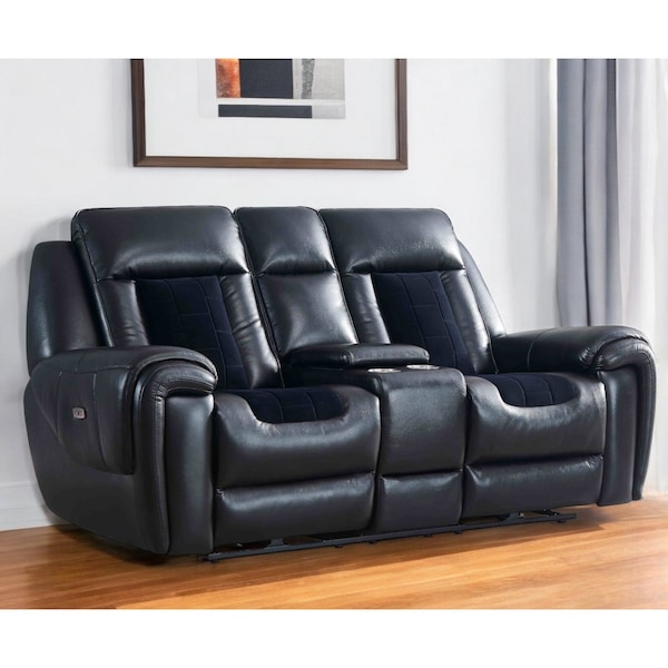 Add an air of fashion to your space with this fabulous 79-inch black power reclining loveseat with storage. Pillow top arms offer a comfy place to rest and give this piece some interest and shape. A center console includes two cup holders for convenience and both seats recline for the ultimate in relaxation. Black metal legs effortlessly elevate the room and add a touch of contemporary design. A great showpiece for your room, this sofa is a must have. 40.9-inch H x 78.7-inch W x 38.6-inch D