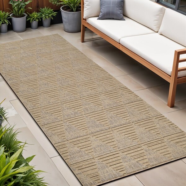 Add great coloration and comfortable texture to your space with this 8-foot beige and brown geometric distressed indoor outdoor runner rug. This runner shaped rug features a geometric design that will work well both indoors or out. A classic shape marries with good looking design for your living room, hall, bedroom, porch, patio, or poolside. Ideal for outdoor spaces or high traffic areas with kids and pets, this rug is made from heavy duty polypropylene that is stain resistant to help repel water, dirt, and stains. Versatile in use, durable, and easy to maintain, this rug is an ideal solution to add a decorative and inviting touch to your indoor or outdoor space. 27.39-inch h x 96-inch w x 0.31-inch d