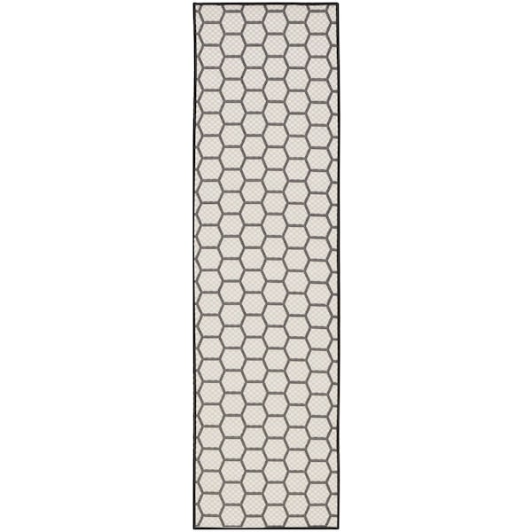 8' Black And Ivory Geometric Indoor Outdoor Runner Rug