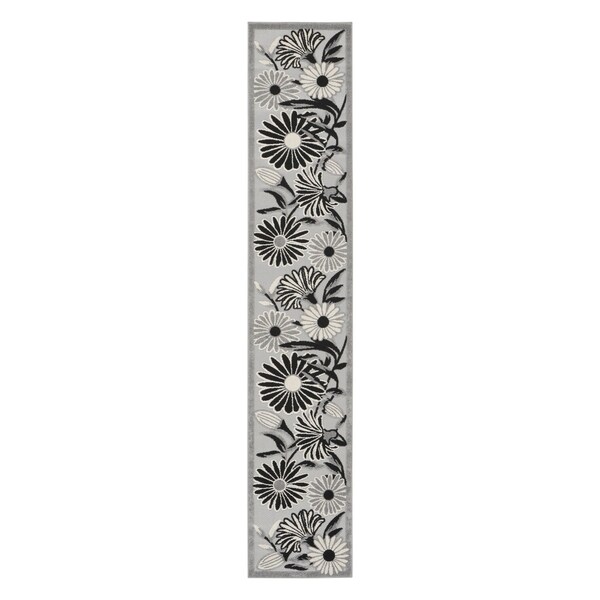 8' Black And White Floral Indoor Outdoor Runner Rug