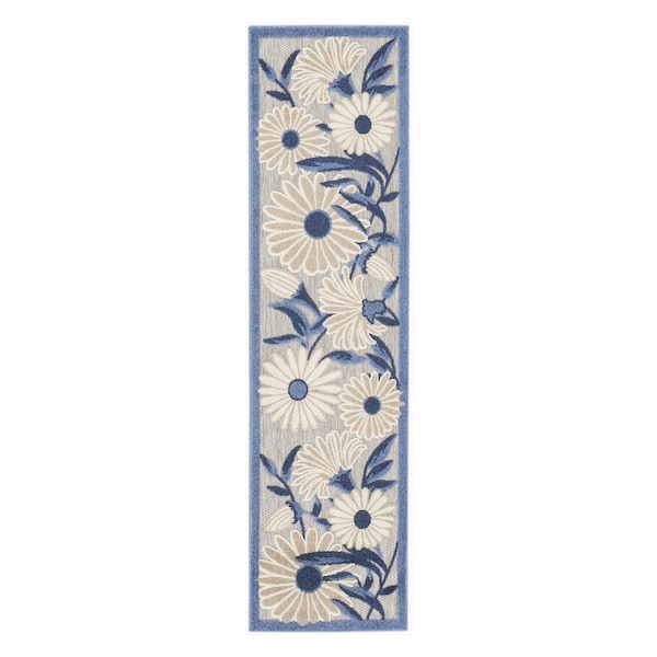 8' Blue And Gray Floral Indoor Outdoor Runner Rug