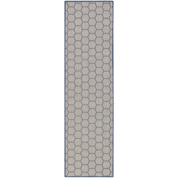 Set an inviting tone in your space with this 8-foot blue and ivory geometric indoor outdoor runner rug. This runner shaped rug features a geometric design that will work well both indoors or out. A classic shape marries with good looking design for your living room, hall, bedroom, porch, patio, or poolside. Makes a great way to dress up your patio, porch, or poolside, but also works well as a durable and easy to maintain option in the kitchen, family room, or mudroom. 26-inch h x 96-inch w x 0.23-inch d.