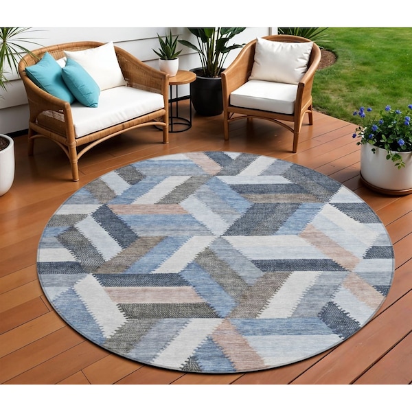 8' Blue Round Geometric Washable Indoor Outdoor Area Rug