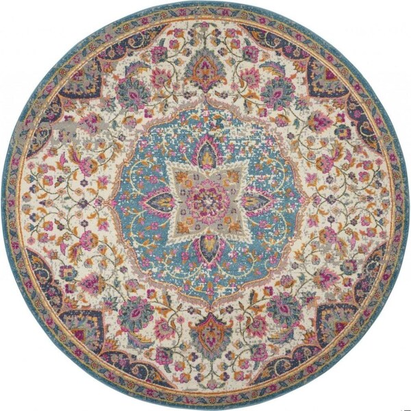 8 ft. Round Pink & Blue Floral Medallion Area Rug