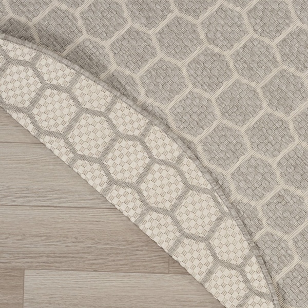 Set an inviting tone in your space with this 8-foot gray and ivory geometric indoor outdoor area rug. This rectangle shaped rug features a geometric design that will work well both indoors or out. A classic shape marries with good looking design for your living room, hall, bedroom, porch, patio, or poolside. Versatile in use, durable, and easy to maintain, this rug is an ideal solution to add a decorative and inviting touch to your indoor or outdoor space. 96-inch h x 96-inch w x 0.23-inch d.