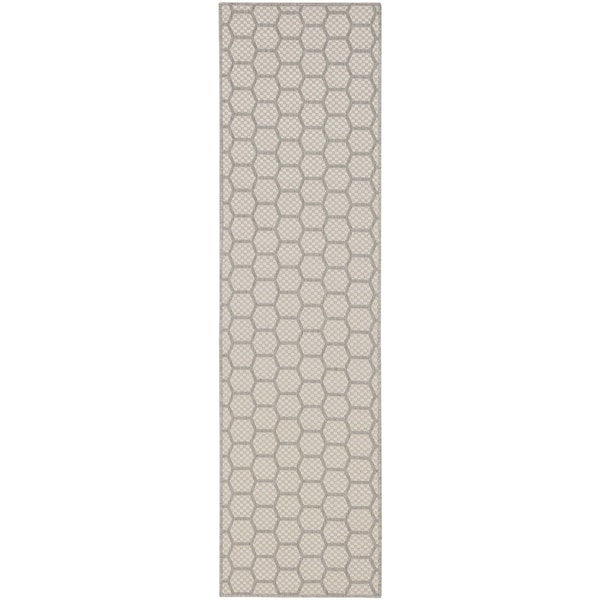 This 8-foot gray and ivory geometric indoor outdoor runner rug, is a great way to add warmth to a room. This runner shaped rug features a geometric design that will work well both indoors or out. A classic shape marries with good looking design for your living room, hall, bedroom, porch, patio, or poolside. Versatile in use, durable, and easy to maintain, this rug is an ideal solution to add a decorative and inviting touch to your indoor or outdoor space. 26-inch h x 96-inch w x 0.23-inch d.