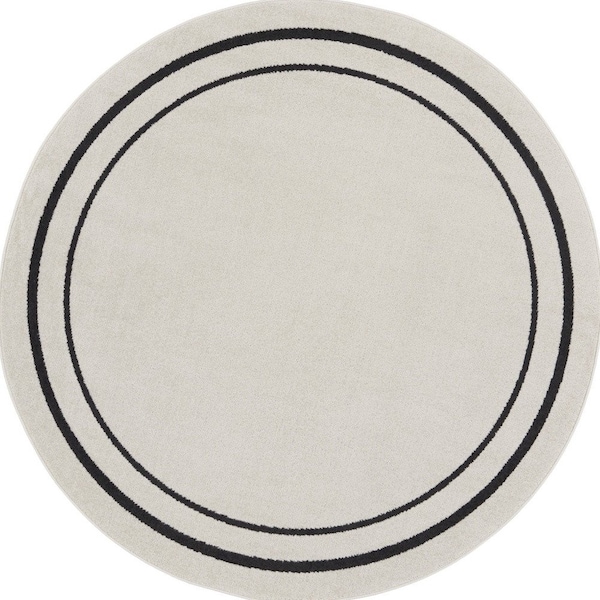 Set an inviting tone in your space with this 8-foot ivory and black round indoor outdoor area rug. This geometric round shaped rug features a solid color that combines hue and shape for a great look. Solid colors are versatile and will blend with any existing decor style. Makes a great way to dress up your patio, porch, or poolside, but also works well as a durable and easy to maintain option in the kitchen, family room, or mudroom. 96-inch h x 96-inch w x 0.25-inch d.