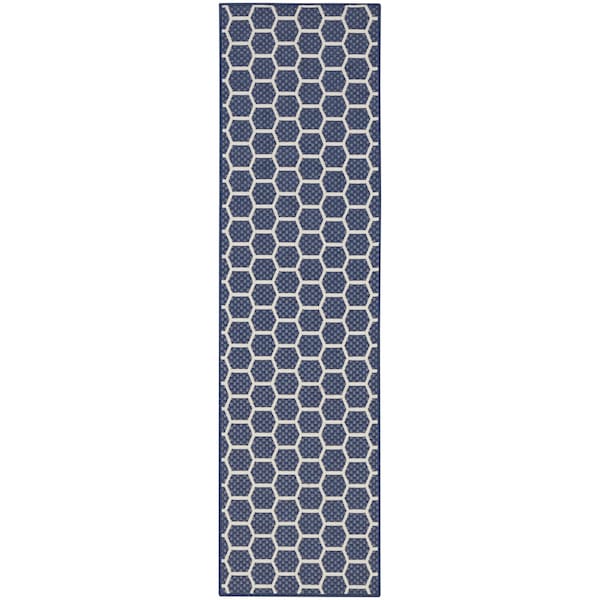 8' Navy Blue And Ivory Geometric Indoor Outdoor Runner Rug