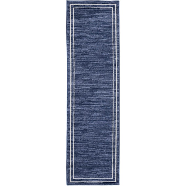 This 8-foot navy blue and ivory indoor outdoor runner rug, is a great way to add warmth to a room. This runner shaped rug flaunts a navy blue and ivory color that will be a great way to accent your space. Solid colors are versatile and will blend with any existing decor style. Makes a great way to dress up your patio, porch, or poolside, but also works well as a durable and easy to maintain option in the kitchen, family room, or mudroom. 26-inch h x 90-inch w x 0.25-inch d.