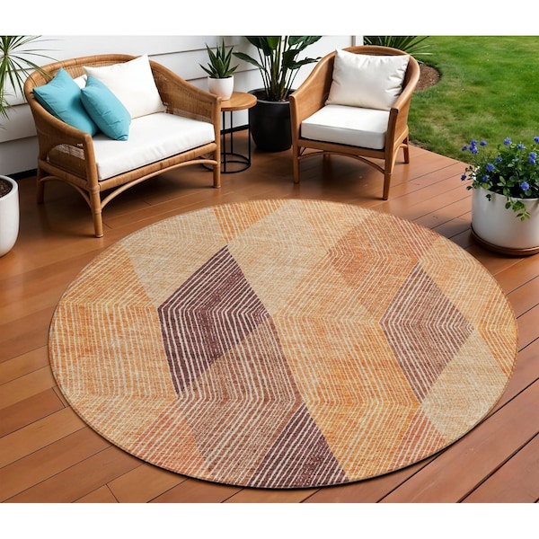 Set an inviting tone in your space with this 8-foot orange peach and ruby red round argyle washable indoor outdoor area rug. This geometric round shaped rug features a argyle pattern in orange, peach, and ruby red that combines a good looking print with a unique and updated shape. The mix of shape, color, and design gives this rug refreshing visual interest. Ideal for outdoor spaces or high traffic areas with kids and pets, this rug is made from heavy duty polyester that is stain resistant to help repel water, dirt, and stains. Versatile in use, durable, and easy to maintain, this rug is an ideal solution to add a decorative and inviting touch to your indoor or outdoor space. 96-inch h x 96-inch w x 0.19-inch d.