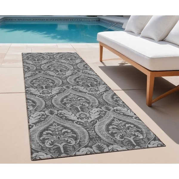 Set an inviting tone in your space with this 8-foot runner gray damask washable stain resistant non skid indoor outdoor runner rug. This runner shaped rug features a damask design in gray to give it visual interest. A classic shape marries with good looking design for your space the coloring of this rug adds a delightfully neutral tone to your home and will easily match with most any decor. Ideal for spaces with kids and pets, this rug is stain resistant to help repel stains and spilled liquids. Place this area rug against a hardwood or tile floor and it will enliven your living space with style and sophistication. 27-inch H x 90-inch W x 0.19-inch D