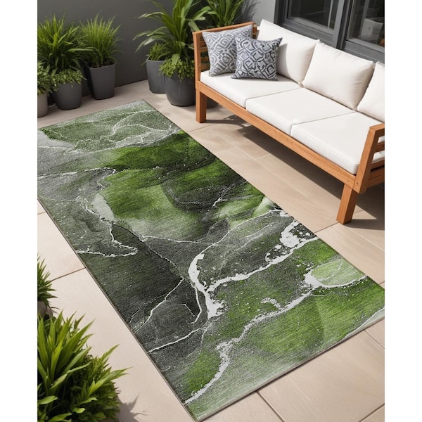 Set an inviting tone in your space with this 8-foot runner green abstract washable stain resistant non skid indoor outdoor runner rug. This runner shaped rug features a abstract design in green to give it visual interest. A classic shape marries with good looking design for your space ideal for spaces with kids and pets, this rug is stain resistant to help repel stains and spilled liquids. Place this area rug against a hardwood or tile floor and it will enliven your living space with style and sophistication. 27-inch H x 90-inch W x 0.19-inch D
