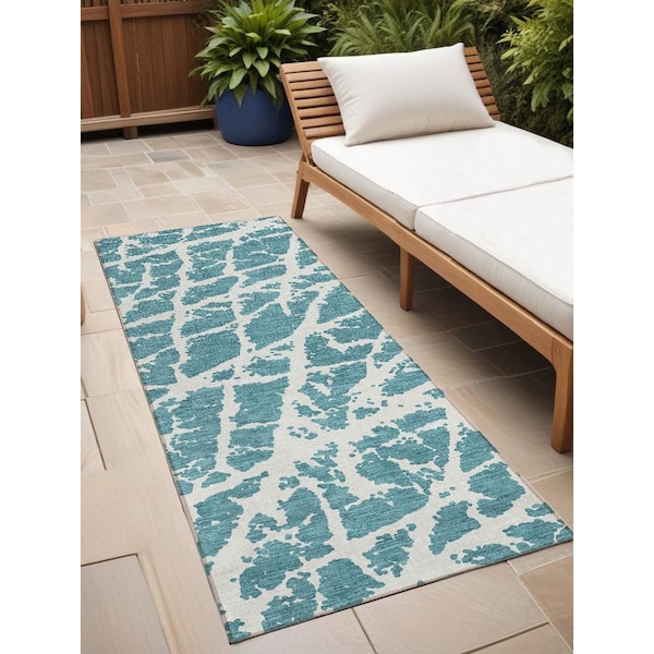 Set an inviting tone in your space with this 8-foot runner teal abstract washable stain resistant non skid indoor outdoor runner rug. This runner shaped rug features a abstract design in teal to give it visual interest. A classic shape marries with good looking design for your space ideal for spaces with kids and pets, this rug is stain resistant to help repel stains and spilled liquids. Area rugs help to give warmth and sense of home to your space. 27-inch H x 90-inch W x 0.19-inch D