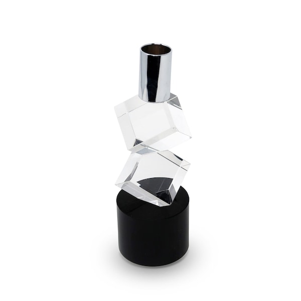 This 8-inch silver clear and black crystal tabletop taper candlestick is a great addition to your home decor and sure to complement your existing furniture. Dress up your home to impress every season with this fabulous candleholder. Features a modern and contemporary optical crystal layered geometric block design in a chic silver, clear, and black color combination. 7.5-inch h x 2.5-inch w x 2.5-inch d.