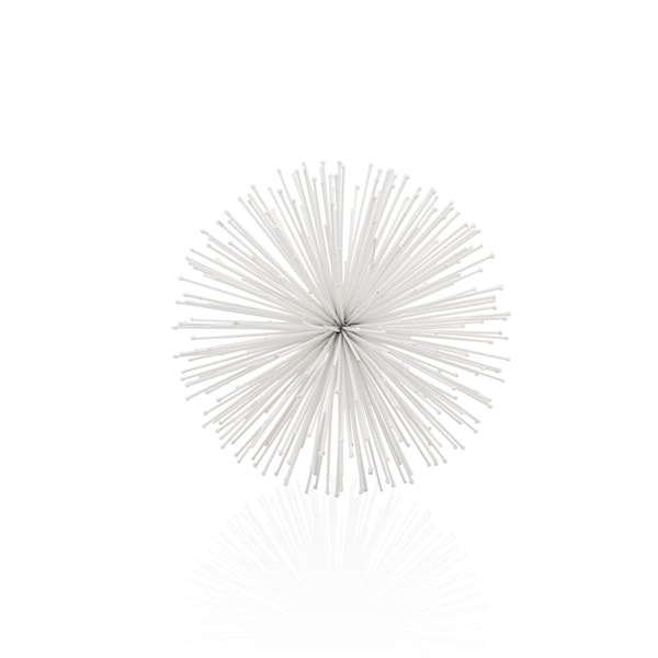Unique and decorative, this 8-inch white iron decorative orb tabletop sculpture will leave a lasting impression. This white colored piece, with its geometric and spherical design, is made from high grade iron using machine-made manufacturing. Perfect for adding a touch of elegance to any space, this decorative orb sculpture seamlessly blends into any decor scheme with its clean white color palette. 8-inch H x 8-inch W x 8-inch D