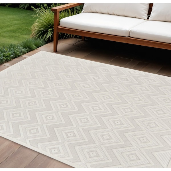 Add some artistry to your room with this 8-foot x 10-foot cream indoor outdoor area rug. Versatile in use, durable, and easy to maintain, this rug is an ideal solution to add a decorative and inviting touch to your indoor or outdoor space. Crafted with machine-made precision, it offers both style and resilience for everyday use. Its rectangular shape ensures a perfect fit for various settings, while the elegant cream color complements a wide range of decor styles effortlessly. 96-inch h x 120-inch w x 0.3-inch d.