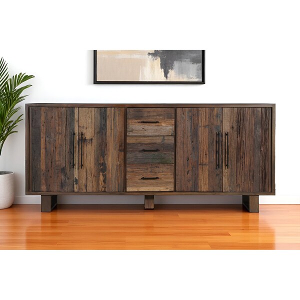 Storage vessels don't have to be unsightly. Increase your storage space and the fashion quotient of your room with this hard wearing, versatile, and good looking cabinet. Crafted from solid mango and reclaimed wood, this sideboard offers a unique charm that highlights its heavily distressed and rustic style. Featuring four cabinet doors, three spacious drawers, and ample shelving, it ensures practicality meets aesthetics seamlessly. The solid wood countertop provides a durable surface for decor, while the sleek black hardware complements the dark brown finish beautifully. 36.00-inch h x 83.00-inch w x 16.00-inch d.