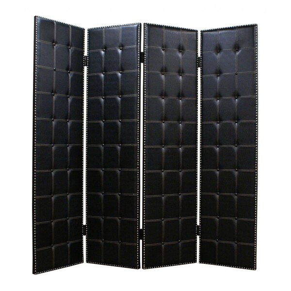 The 84-inch black faux leather folding four panel screen room divider effortlessly enhances your living space. This folding design provides versatility, allowing you to create intimate areas while maintaining an open feel. Crafted with a sturdy wood frame, this screen promises durability and stability. The luxurious faux leather finish adds a touch of sophistication, making it a stylish addition to any decor. With four distinct panels, it offers ample coverage and privacy without sacrificing light. Utilize it in versatile settings such as studios, offices, or homes to redefine your space and elevate your interior aesthetic. This room divider is not just functional; it is a statement piece that combines practicality with design elegance. 84.00-inch h x 84.00-inch w x 1.00-inch d.