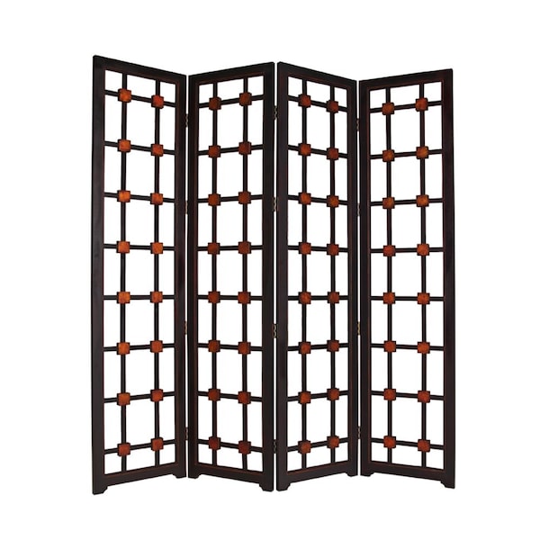 The 84-inch brown folding four panel screen room divider brings versatility and charm to your space. Crafted from sturdy wood, this divider not only enhances privacy but also adds a touch of elegance to any room. Its four-panel design allows for easy setup and repositioning, making it a practical choice for transforming areas as needed. The rich brown finish complements various decor styles, seamlessly blending with your existing furnishings. This folding screen provides an innovative solution for creating distinct zones in open-plan areas while maintaining a cohesive aesthetic throughout your home. Perfect for both functional use and decorative flair, this room divider is an excellent addition to your interior layout. 84.00-inch h x 84.00-inch w x 1.00-inch d.