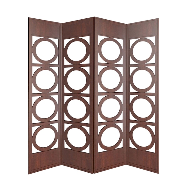 Add a touch of contemporary style to your space with this 84-inch brown solid wood folding room divider. The four panels provide versatility in dividing your room while the solid wood material adds a natural touch to your decor. The rich brown color complements a variety of color schemes, making it a versatile addition to any room. The folding design allows for easy storage when not in use, perfect for smaller spaces. Create privacy or define different areas in your home with this functional and stylish room divider. 84-inch H x 84-inch W x 2-inch D