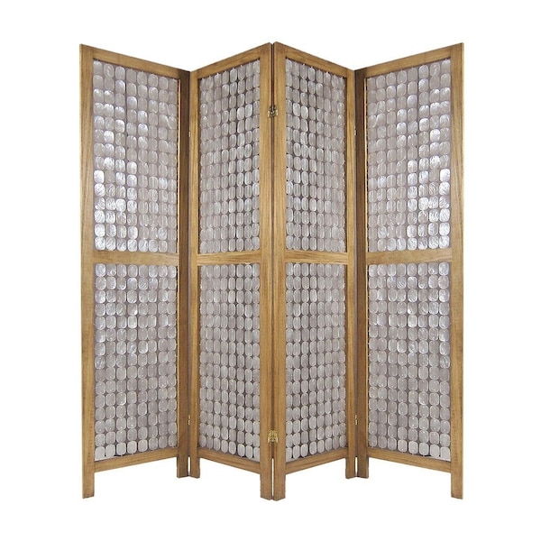 Enhance your living space with this elegant 84-inch clear Capiz mother of pearl folding three panel screen room divider. Crafted from a frame of solid wood, this unique room divider features beautiful strings of Capiz mother of pearl shells that add a touch of casual sophistication to any room. The folding design with three panels offers versatility and functionality, allowing you to easily divide your space or create a stylish accent piece. Add a chic and practical element to your home with this stunning room divider. 84-inch H x 84-inch W x 1.5-inch D