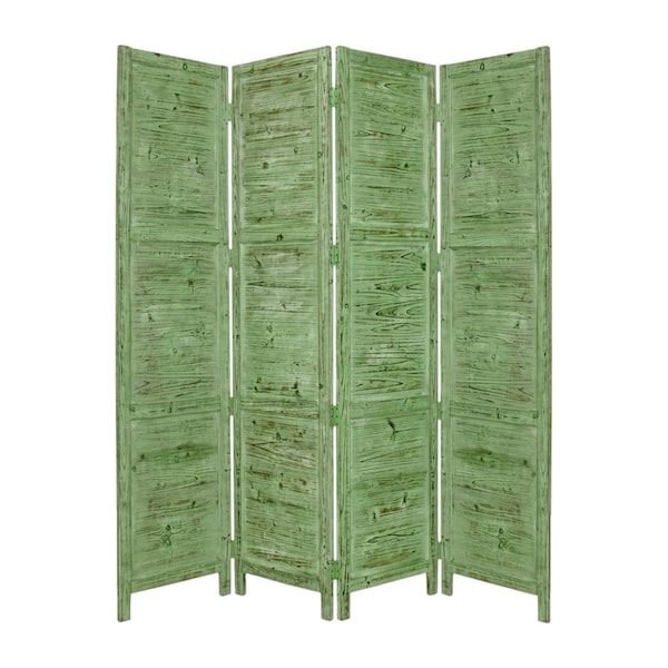 Enhance your space with this 84-inch green rustic wood folding four panel screen room divider, crafted from solid Cedar wood with a charming rustic and distressed green finish. The folding design allows flexibility in dividing your room that is perfect for creating privacy or defining separate areas within a room. This four-panel divider complements various decor themes with its natural wood material and adds a refreshing pop to your space. 84-inch H x 76-inch W x 1-inch D