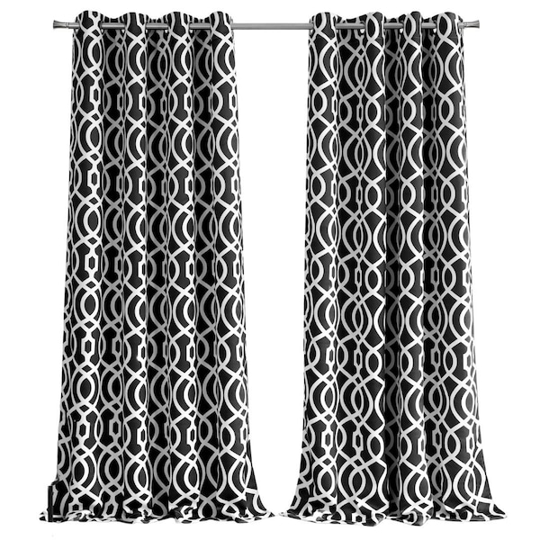 Bring elegance and functionality to your window with our 84-inch jet black trellis black out window curtain panel. Crafted from high-quality polyester, this contemporary style curtain offers blackout light filtration, ensuring a peaceful environment in your home. With a single panel width of 54 inches and a panel length of 84 inches, it provides ample coverage. The striking black and white trellis pattern effortlessly complements any interior decor, adding a touch of sophistication. Perfect for bedrooms, living rooms, or home offices, this curtain panel enhances privacy and blocks out unwanted light. Transform your space with this stunning addition that combines style and practicality seamlessly. 84-inch H x 54-inch W x 1-inch D