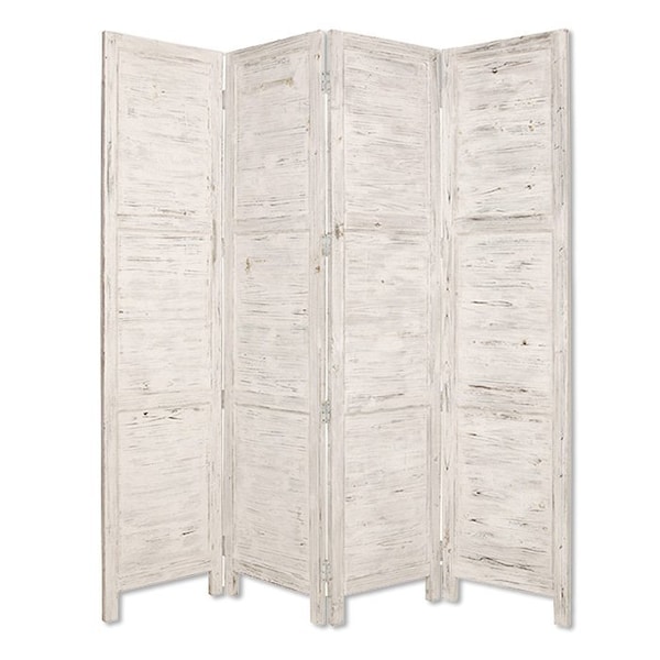 The 84-inch white wood folding four panel screen room divider elegantly enhances your living space while providing versatile privacy options. Crafted from high-quality wood, this screen boasts a sturdy and stylish frame that seamlessly integrates into various decor styles. The four-panel design allows for easy folding, making it simple to adjust your space as needed. Each panel showcases the natural beauty of wood, adding warmth and texture to any room. Ideal for creating separate areas in open-plan homes, this room divider is both functional and decorative. Its lightweight construction means you can reposition it effortlessly, giving you flexibility in your home arrangement. Enjoy a blend of aesthetics and practicality with this beautiful room divider. 84.00-inch h x 76.00-inch w x 1.00-inch d.