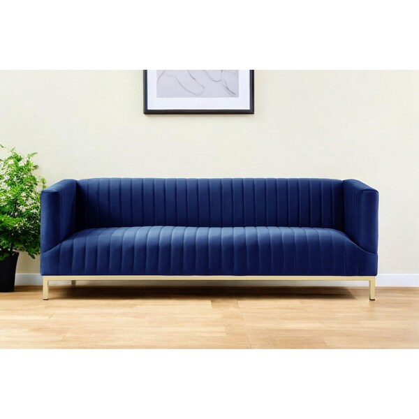 Add an air of fashion to your space with this fabulous 85-inch navy blue velvet sofa with gold legs. This solid color standard is made from sturdy and resilient velvet that has a warm and rich look and is a super soft and comfortable to the touch. Solid colors give you lots of decorative options and are easy to work into your decor scheme. Square arms offer a comfy place to rest. The tufted stitching pattern adds visual interest and fine designer detailing. Gold metal legs effortlessly elevate the room and add a touch of contemporary design. Built to last, this sofa will be a great centerpiece for your room. 27.9-inch H x 85.4-inch W x 32.7-inch D