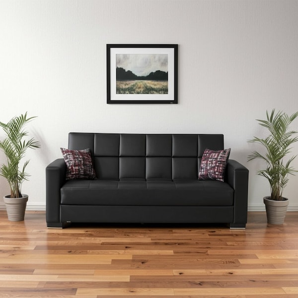 87" Black Faux Leather Convertible Futon Sleeper Sofa And Toss Pillows With Storage
