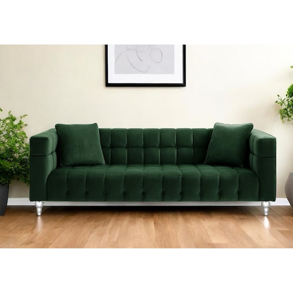 Add an air of fashion to your space with this fabulous 88-inch hunter green velvet sofa and toss pillows with clear legs. With a warm and rich look to it, this solid color standard is upholstered in velvet that is designed to be super soft to the touch, sturdy and resilient. Solid colors give you lots of decorative options and are easy to work into your decor scheme. Sinuous springs construction gives this piece strong support and makes it comfortable to sit even for long periods of time. Square arms offer a comfy place to rest. The tufted stitching pattern adds visual interest and fine designer detailing. Clear acrylic legs effortlessly elevate the room and add a touch of contemporary design. Built to last, this sofa will be a great centerpiece for your room. 29-inch H x 88-inch W x 33.8-inch D